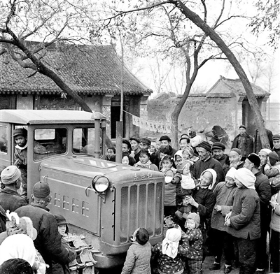 1958年,中國第一臺履帶式拖拉機(jī)“東方紅”開進(jìn)村莊。