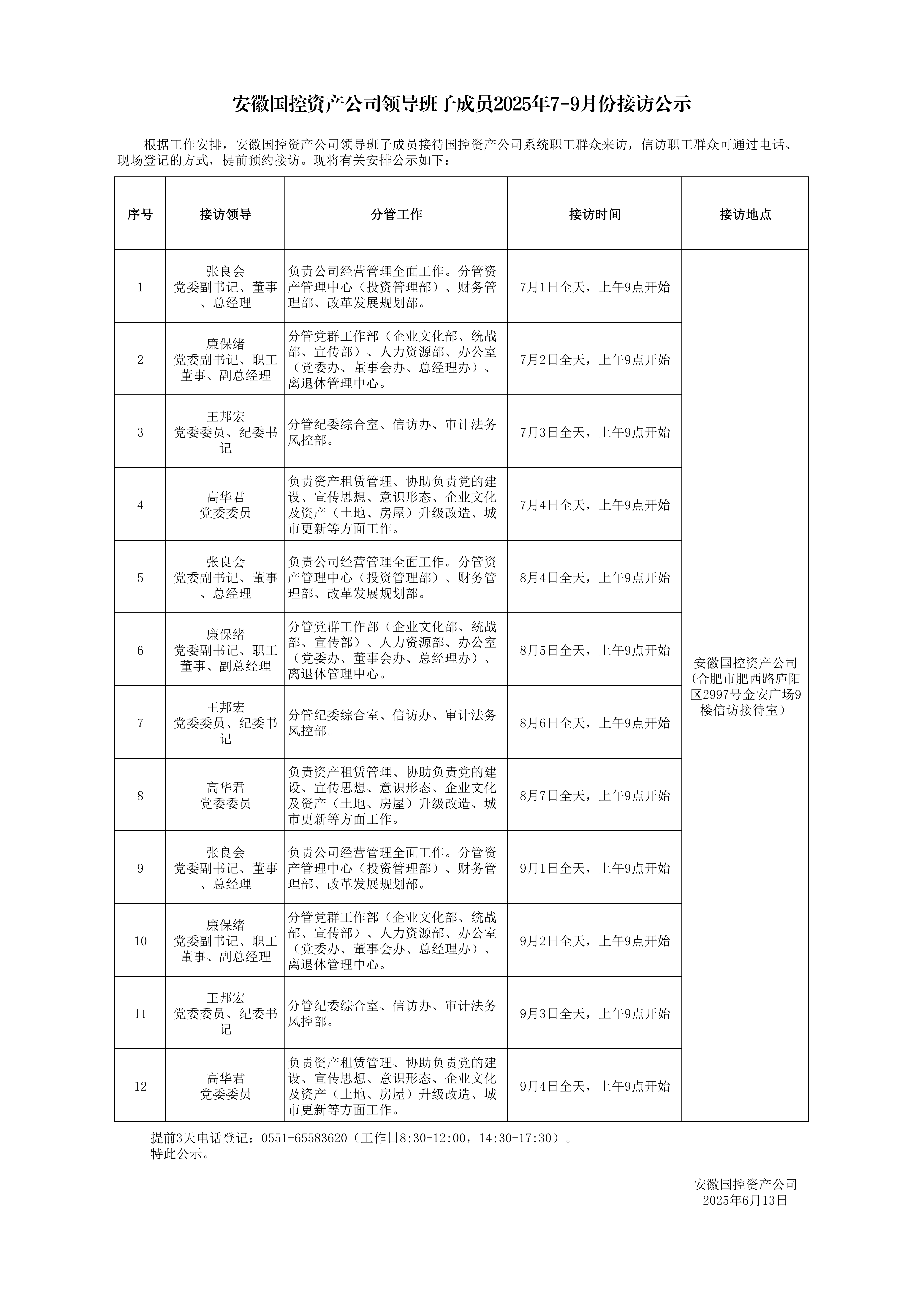 當(dāng)前位置:首頁(yè)>>新聞中心>>通知公告>>安徽國(guó)控資產(chǎn)公司領(lǐng)導(dǎo)班子成員2025年7-9月份接訪(fǎng)公示