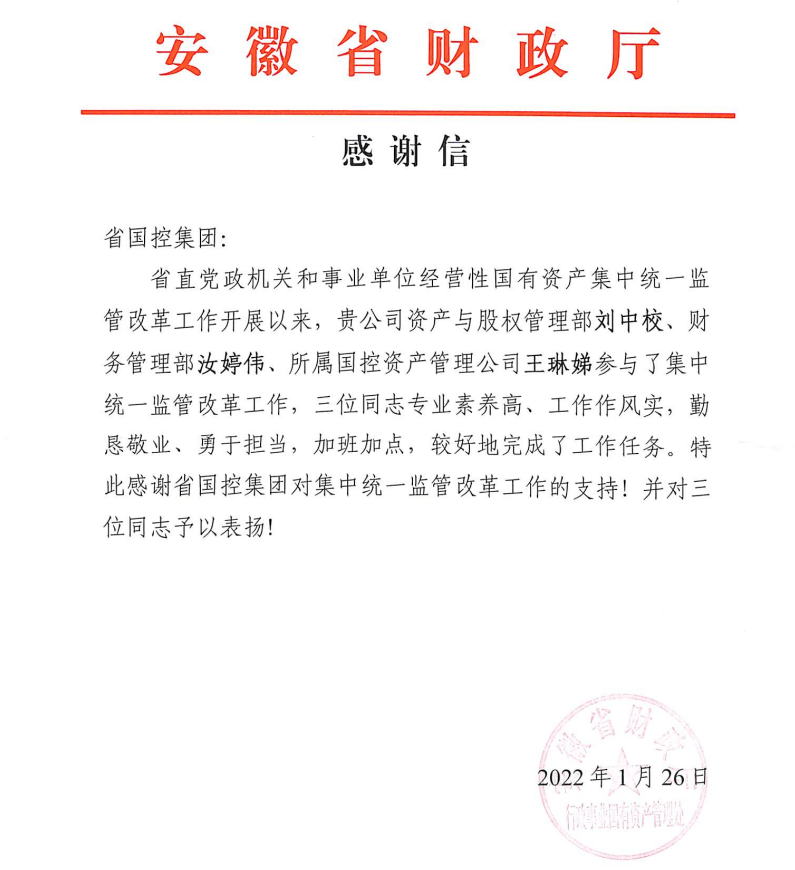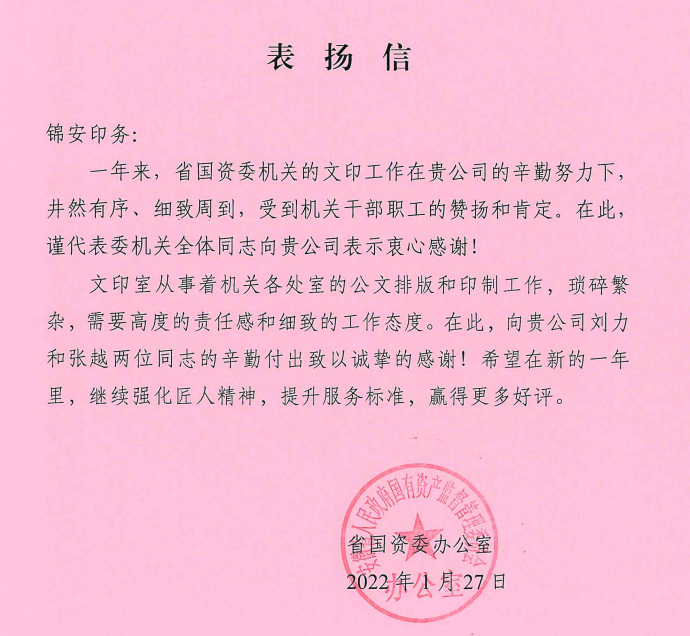 近日,公司所屬安徽省錦安印務(wù)有限公司收到省國資委辦公室表揚(yáng)信,對劉力和張?jiān)絻晌煌镜男燎诟冻鲋乱哉\摯的感謝。省財(cái)政廳行政事業(yè)國有資產(chǎn)管理處向國控集團(tuán)發(fā)來感謝信,對王琳娣同志專業(yè)素養(yǎng)高、工作作風(fēng)實(shí),勤勤懇懇、勇于擔(dān)當(dāng),加班加點(diǎn),較好地完成了工作任務(wù),予以表揚(yáng)。